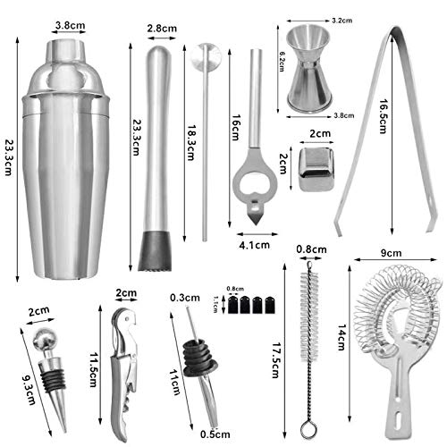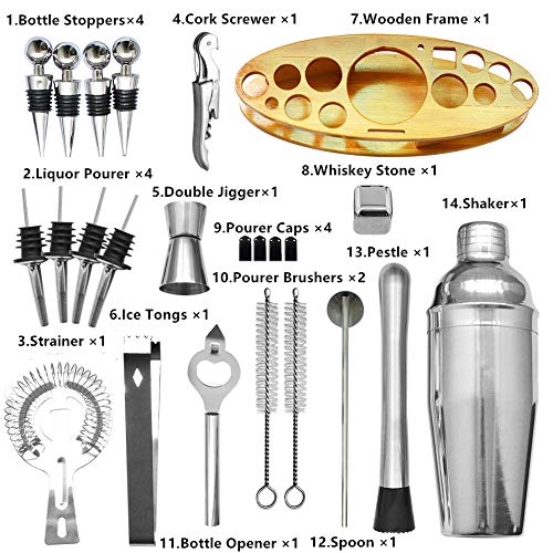 - π[23+1 PCS Cocktail Shaker Set] : This Cocktail Making Set contains 1* Bar Shaker,1*Jigger,1*Pestle,1*Spoon,1* Strainer,1* Cork Screwer,1*Ice Tong,1*Bottle Opener,1*Whisky Stone,2*Pourer Brushes,4* Pourers,4*Bottle Stopers,4*Pourer Caps,1*Wooden Frame.Whether you are an at-home drink enthusiast or even a professional bartender, this cocktail kit is perfect for creating great-tasting drinks.