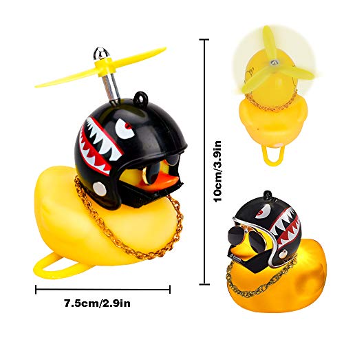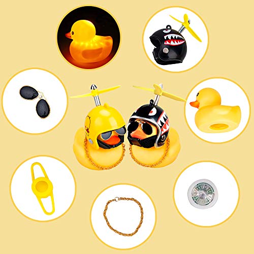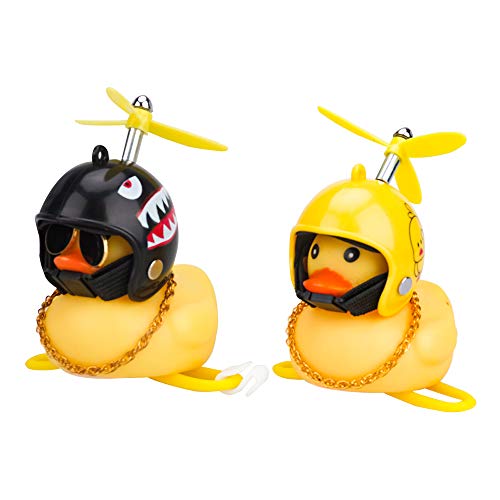 • 🐤【Cute & Cool Rubber Ducks】This product is sold by 2 rubber ducks toys as a group. Ducks wear helmets (one helmet is the popular Little Yellow Duck style on TikTok, the other helmet is the handsome Shark style). A propeller is hung on duck's helmet, a domineering gold chain is worn around it's neck, and handsome sunglasses are worn on it's eyes. Children will feel very cute and handsome when they see these two ducks, and they will probably play all day.