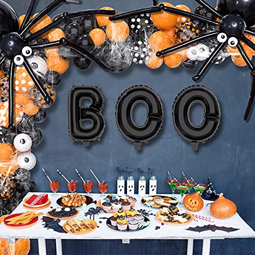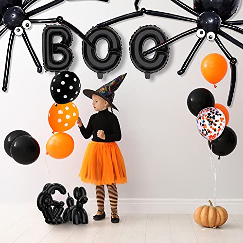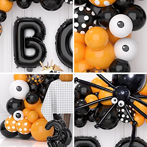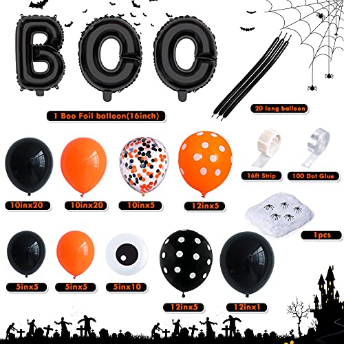 - Halloween Balloon Decorations Include: 20 * 10" black balloons, 20 * 10" orange balloons, 5 * 12" black dot balloons, 5 * 12" orange dots balloons, 5 * 10" sequined balloons, 5 * 5" black balloons, 5 * 5" orange balloons, 10 * 5" eyeball balloons, 20 * long balloons, 1 * 12" black balloon, 1 * 16" BOO foil balloons,1 * spider web,1 * 100 dot glue, 1 * 16ft strip.