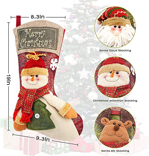 COOLWUFAN Christmas Stockings, 3 Pack 18″ Personalized Xmas Stockings with 3D Snowflake Santa, Snowman, Reindeer for Family Holiday Christmas Party Decorations