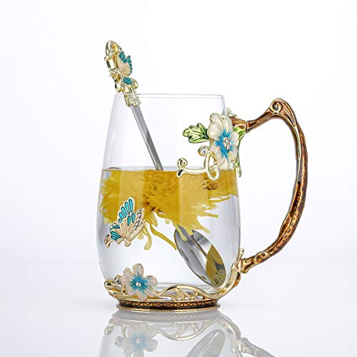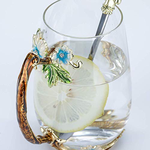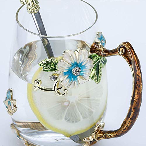 evecase Enamels Butterfly Flower Lead-Free Glass Coffee Mugs Tea Cup with Steel Spoon Set, Personalised Gifts for Women Wife Mum Teacher Friends Christmas Birthday Mothers Valentines Day (Blue)