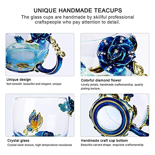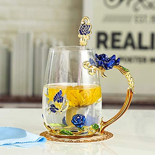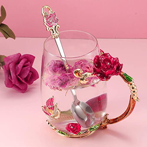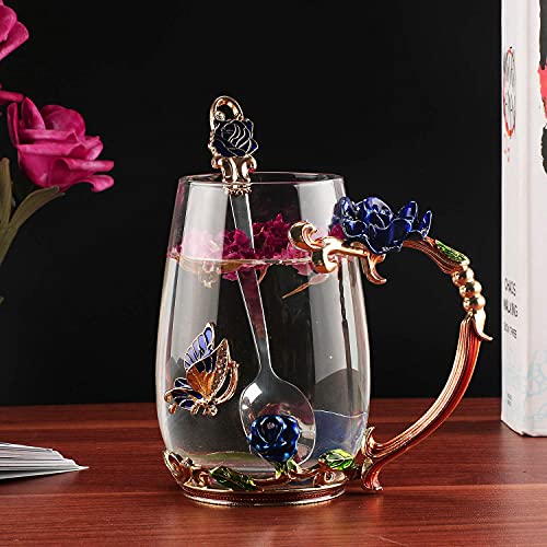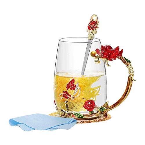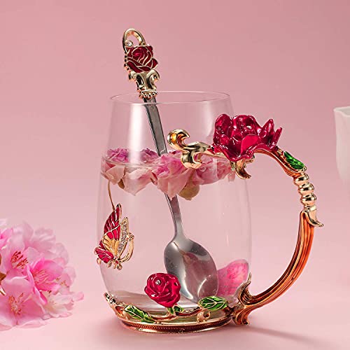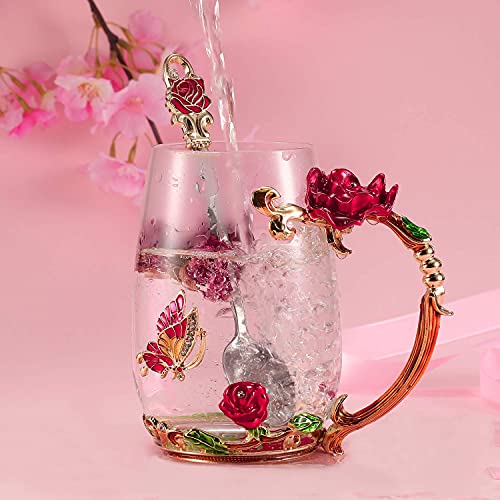- The handmade enamel glass mug(320ml Capacity) has an elegant style with butterfly and red rose flower 3D designs. Never fade as time passed. Glass material of cup is glittering and translucent, classic but refined and the noble stylish look is functional yet decorative