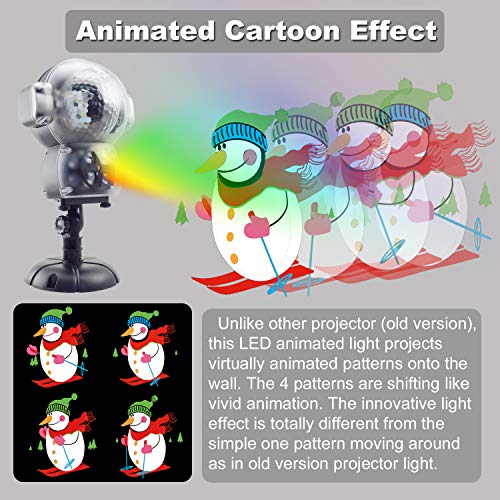 - [Innovative Animated Cartoon] Differ from other simple moving patterns, this animated projector has 8 patterns with each is able to create cartoon effect. It must be kids’ favorite animated light at various holidays.