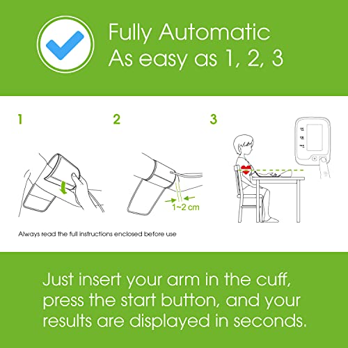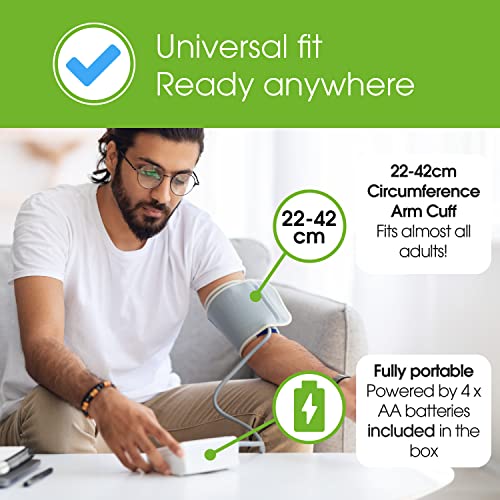 - ✔️ SIMPLE TO USE AND FULLY AUTOMATIC WITH UNIVERSAL / LARGE CUFF Just wrap the blood pressure cuff around your upper arm (suitable for arm circumference 22-42cm) in a relaxed sitting position, press start and that's it! Your Blood pressure and heart rate readings will be displayed on the large LCD screen in less than a minute. Measurements include: systolic pressure, diastolic pressure, pulse rate, date, time, and user ID.
