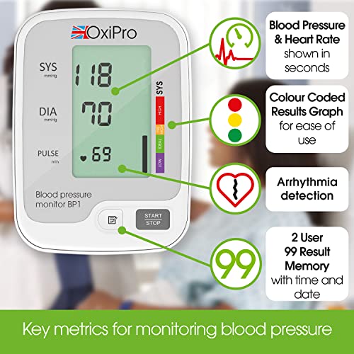 - ✔️ TWO USER MODE WITH 99 RESULTS STORED The OxiPro BP1 blood pressure machine supports 2 users, each with up to 99 records stored against their user. Automatically displays the average of your last 3 readings. The OxiPro BP Machine helps users to easily track their health, blood pressure and heart rate according to the specific time and date. A great option for blood pressure machines for home use.