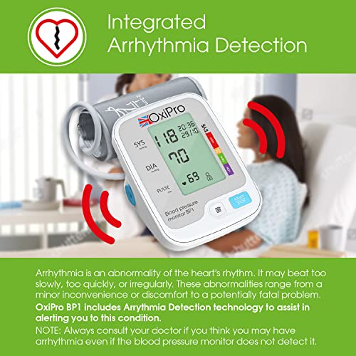 - ✔️ ACCURATE BLOOD PRESSURE AND PULSE READINGS shown to 1 mmHg resolution for systolic and diastolic pressure, 1 bpm resolution for heart rate monitoring. The OxiPro BP 1 is an upper arm blood pressure monitor which is CE Class II Medical Device Certified Blood pressure machine recommended by doctors for monitoring and recording blood-pressure.