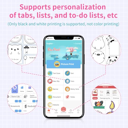 - 【Multifunctional】Photo printer can be used to print small labels, photos, sticky notes, to-dos, records, memos and lists (only supports black and white printing, not color printing). In addition, the APP provides many different types of patterns, fonts and themes for you to choose from to meet your various needs.