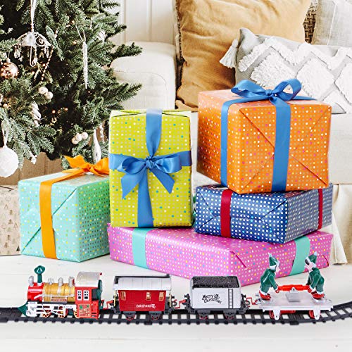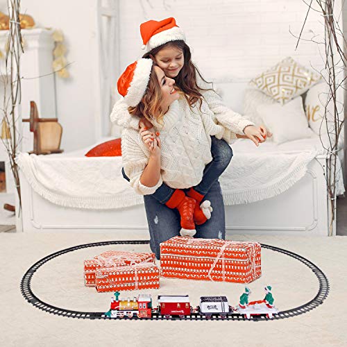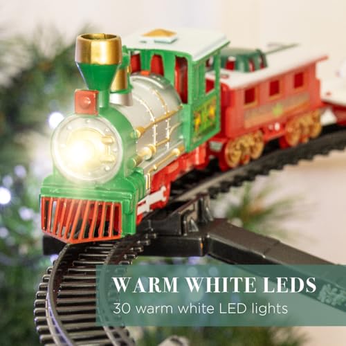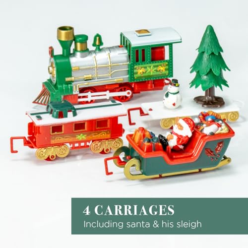 - The Christmas train set features 1 x classic steam engine, 3 x festively themed carriages, 8 x curved track pieces, and 4 x straight track pieces.